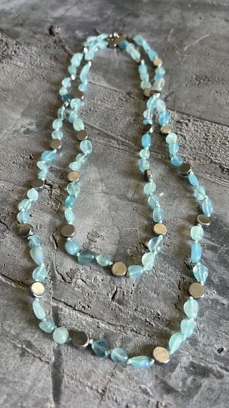 O Colar Água Marinha tem detalhes na Hematita Metalizada e em média 1 metro e 10cm mais extensor, produzido no fio encerado.