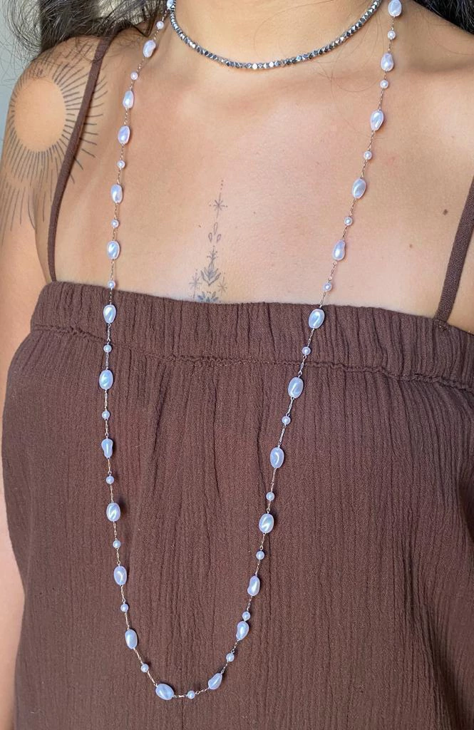 O colar madrepérolas tem 95cm e pode ser usado com 1 ou 2 voltas, ele é todo de aço inox.